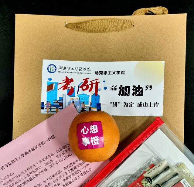 据了解,礼物袋中贴有“心想事成”、“乘风破浪”等字样的橙子、“连中三元”寓意的文具袋等是由宋平、樊勇、教学办教师余珮和辅导员王一于12月24日晚亲自准备并包装的,而其中的手写信则是由2018级员工给各自一对一学长学姐亲手写的。“刚刚进入大学校园的时候,一对一的学长学姐给素不相识的我们写了一封信,之后也给了我们很多帮助。所以今天,我们也将自己亲手写的一封信作为一个小礼物来回赠他们,预祝他们考研成功”,2018级思想政治教育1班张敏敏说道。