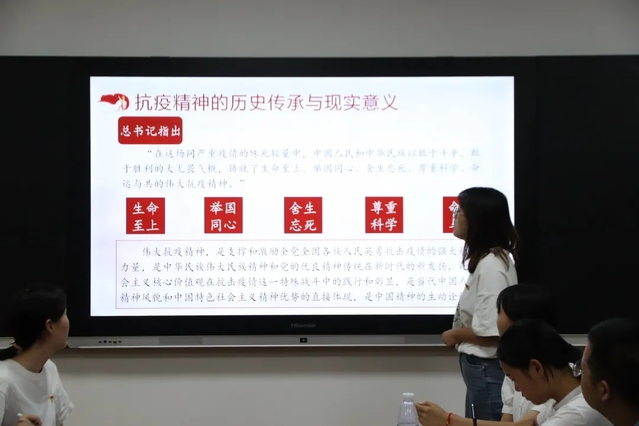 接着,2018级思想政治教育1班万炼同志作《大力弘扬新时代“抗疫精神”》的主题微党课分享,在分享中万炼从抗疫精神的历史传承与现实意义、新时代抗疫精神的丰富内涵以及大力弘扬新时代伟大抗疫精神三个方面进行了详细解读,并号召党员要学习抗疫精神并将这种精神发扬光大。