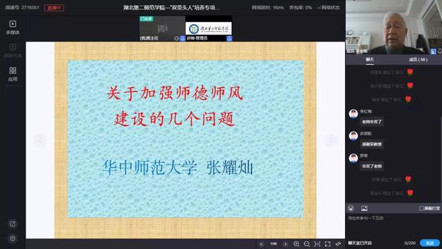 12月13日下午,华中师范大学教授、博士生导师张耀灿为湖北省2021年“中小学幼儿园教师素质提升工程”——“双带头人”专项培训班作《关于加强师德师风建设的几个问题》专题讲座,培训班全体学员准时前往直播间听取讲座。