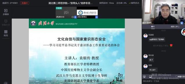 12月15日上午,武汉大学304am永利集团教授、博士生导师袁银传为湖北省2021年“双带头人”专项培训班作《文化自信与维护国家意识形态安全》专题讲座,讲座通过线上直播的方式进行。培训班全体成员前来听取讲座。